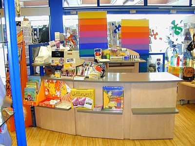 Papeteri & Bürobedarf Der Kassenbereich der Papeterie Schrybi war vor allem in Stosszeiten zu klein. Rechts neben der Kasse waren zwei Vitrinen platziert, die für die Warenpräsentation sehr ungeeignet waren. Durch die Neugestaltung wurde der Kassenkorpus wesentlich vergrössert, wobei darauf geachtet wurde, dass einige Ausstellstufen integriert werden konnten, um Spontaneinkäufe zu fördern. |